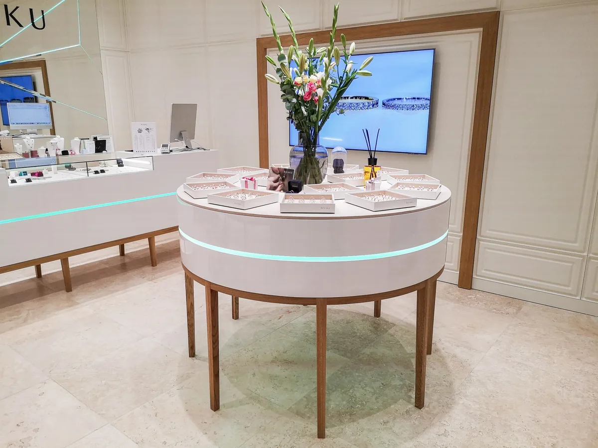 Důležitou roli hraje také promyšlené osvětlení, které zvýrazňuje detaily vystavených šperků a vytváří příjemnou atmosféru pro zákazníky. Digitální obrazovky a prezentační plochy zároveň umožňují představit značku i její výrobní proces.