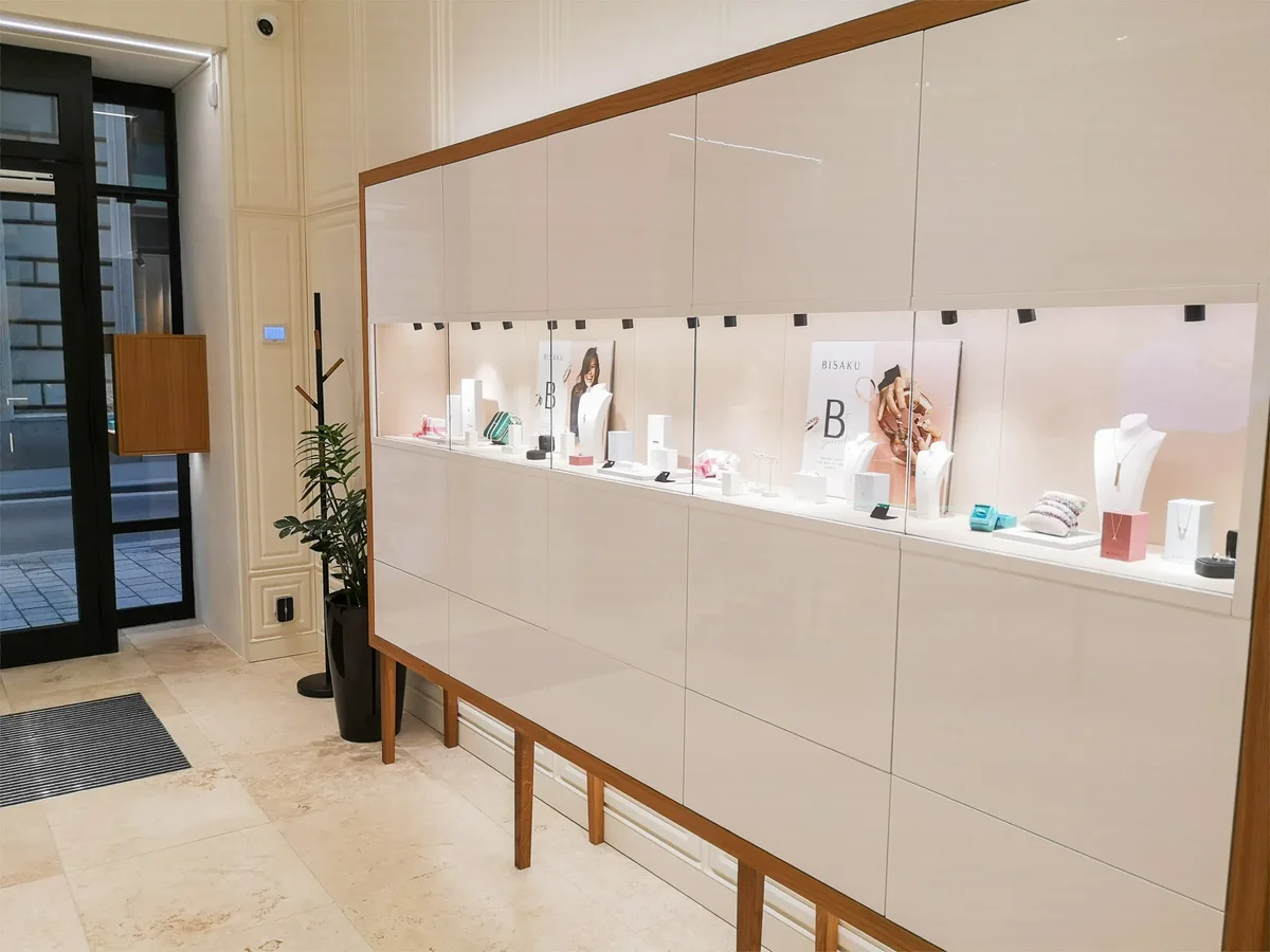 Pro značku BISAKU jsme navrhli a realizovali interiér prodejny šperků ve Vídni, který navazuje na elegantní vizuální identitu značky a zároveň respektuje reprezentativní charakter lokality. Cílem návrhu bylo vytvořit luxusní, ale zároveň velmi čistý a přehledný prostor, ve kterém mohou šperky přirozeně vyniknout.