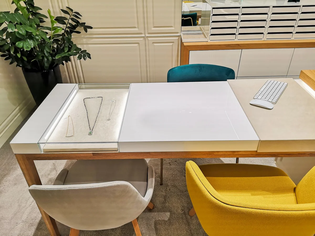 Důležitou roli hraje také promyšlené osvětlení, které zvýrazňuje detaily vystavených šperků a vytváří příjemnou atmosféru pro zákazníky. Digitální obrazovky a prezentační plochy zároveň umožňují představit značku i její výrobní proces.